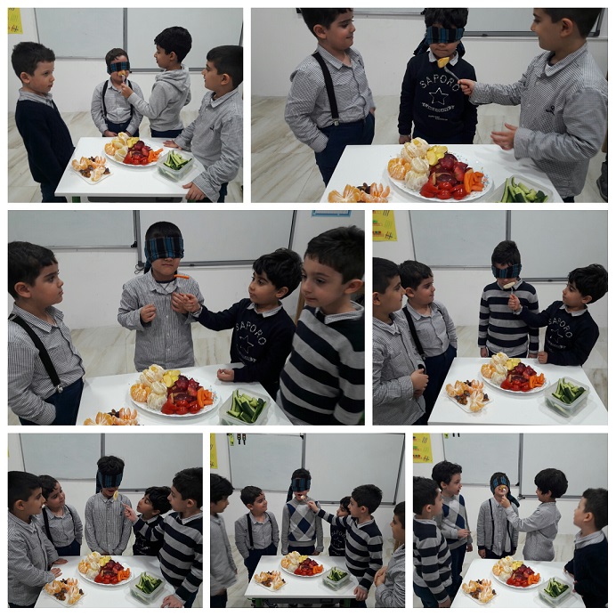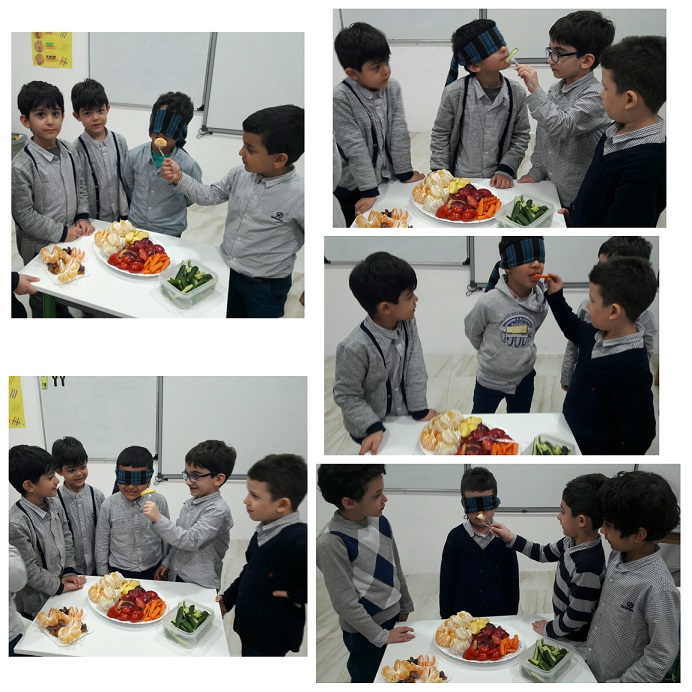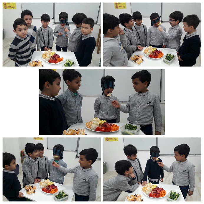 دانش آموزان کلاس اول اندیشه در حال انجام آزمایش علوم ( چشم ها بسته )